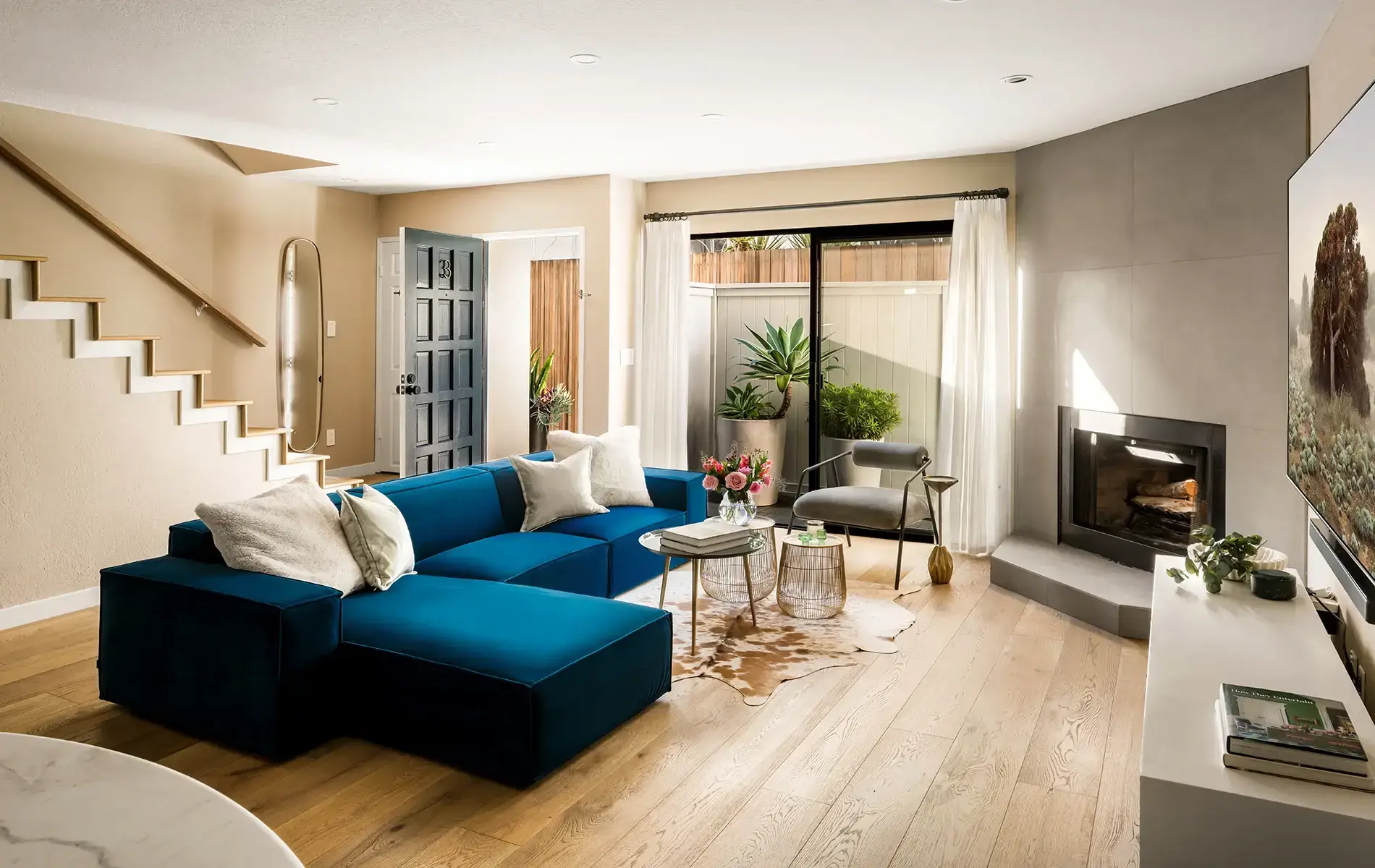 Three blocks from the ocean in Santa Monica, this light-filled coastal townhome features soaring vaulted ceilings, an indoor-outdoor living space, and the convenience of a direct-access private two-car garage.