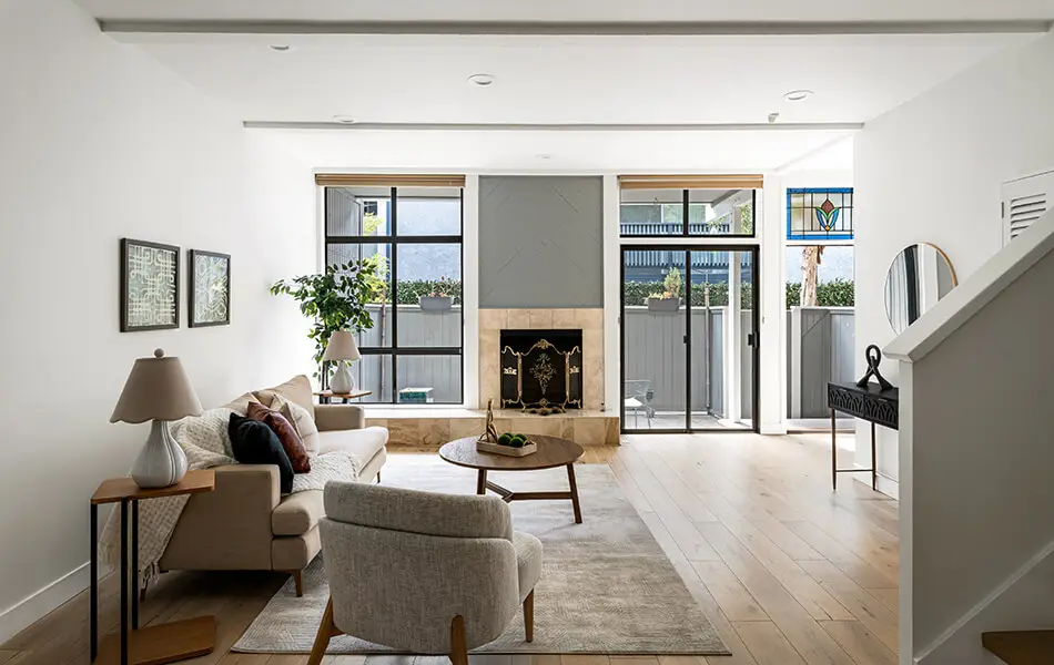 Three blocks from the ocean in Santa Monica, this light-filled coastal townhome features soaring vaulted ceilings, an indoor-outdoor living space, and the convenience of a direct-access private two-car garage.